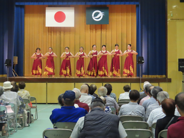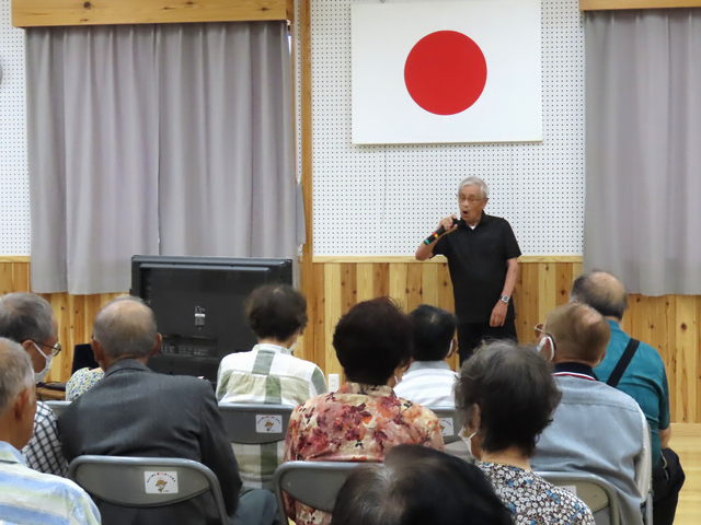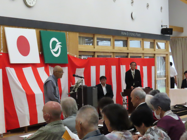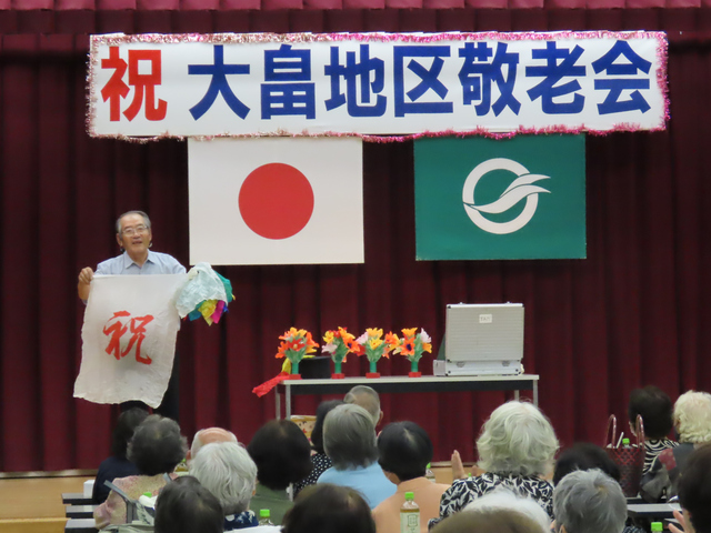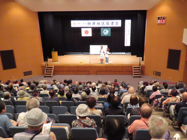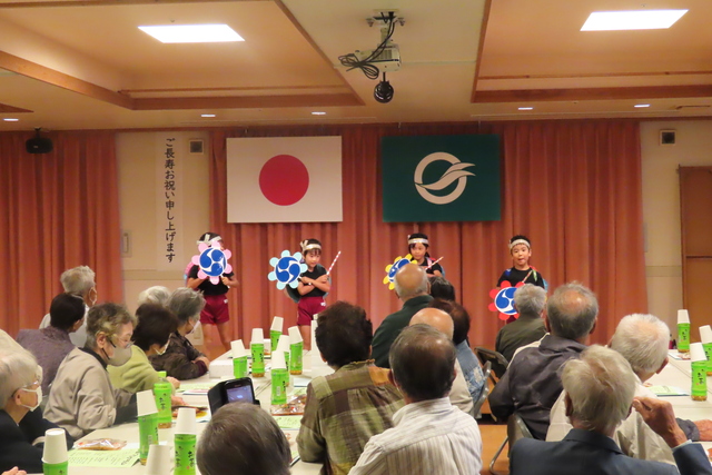 令和6年9月26日に阿月地区敬老会を開催しました。式典では、米寿の方への記念品の贈呈、敬老功労者表彰、柳井南小学校児童による敬老作文の発表などが行われました。演芸の部では、柳井南保育所園児による遊戯、地域の方による合唱やカラオケの披露がありました。