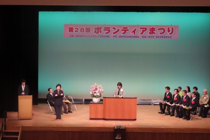 多目的ホールでは、式典・表彰式、ボランティア団体の活動報告やアトラクションを行いました。会場内では、「糸かけアート」「ストラップ作り」「折り紙」の作品作りや「点字」を打つ体験コーナーを実施し、多くの人が楽しんでおられました。また、柳井ライオンズクラブの皆さまの呼びかけにより76名(90名受付)の方に献血のご協力をいただきました。『もったいないキャンペーン』として、PETボトルキャップ17.1㎏、使用済み割りばし5.2㎏、書き損じはがき14枚、使用済み切手0.5㎏をご協力いただきました。